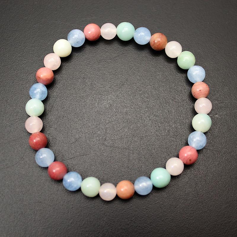 Ce bracelet en pierres naturelles de 6 mm associe l’aigue-marine, le quartz rose, l’amazonite et la thulite dans une harmonie de couleurs douces et apaisantes. Élégant et lumineux, il est idéal pour accompagner le quotidien tout en favorisant l’équilibre émotionnel.