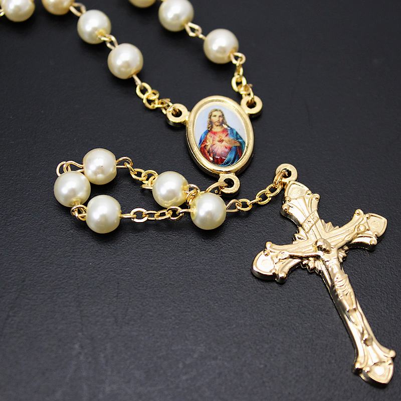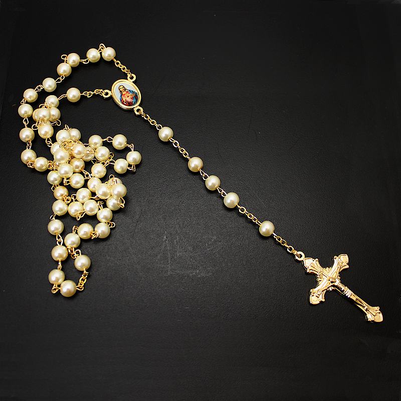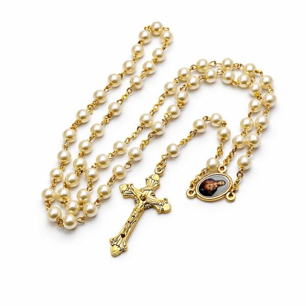 Composé de perles nacrées et d’une croix finement travaillée, il est orné d’une médaille représentant le Christ, rappelant la puissance de l’amour divin et du pardon.